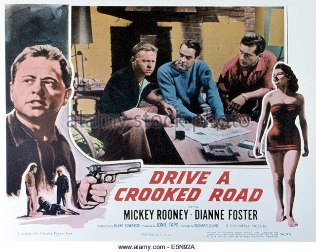 I'm a big fan of the American Cinematheque's Sunday Print Edition series at the Los Feliz 3. They screen a mix of well-known and obscure black and white movies on 35mm every Sunday afternoon. One of this year's standouts is Drive a Crooked Road, a 1954 noir starring Mickey Rooney in a dramatic rather than a comic role. Rooney plays a mechanic hired by bank robbers to transport them over extremely dangerous desert roads at maximum speed after a heist. Turns out he has serious acting chops, who knew. It's a tragic story and I nearly wept for Rooney's character at the end. I believe it's streaming on Amazon Prime these days.